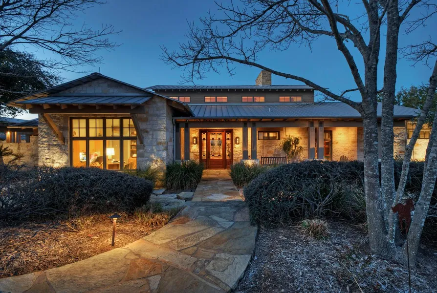 Located in gated Madrone Ranch in the heart of the hill country, this luxury estate sits on a picturesque tract of land with large mature oaks and great views. The house is an exemplary model of hill country design with modern flourishes. A one story residence, it features tall ceilings and lots of open space. The centerpiece of the home is standalone stone fireplace that looks over the main living area. Wood floors and vaulted wood ceilings accent the natural feel. A large gourmet kitchen opens to the main living area. The master suite has a walk-in shower and tile spa.