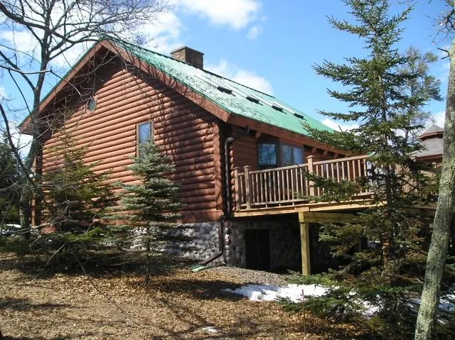 REDUCED PRICE. MLX 874627. MINONG FLOWAGE. Yellowstone Homes full log home, chalet style on 160 ft sandy swimming shoreline on this popular full recreational lake known for great walleye fishing. Also enjoy boating, sailing, skiing, and swimming. Log home designed and lovingly built and cared for by one owner since 1988. Gradual stroll to level area at waters edge facing the largest part of the lake for great views in an easterly direction. Open floor plan, vaulted beamed ceilings, skylights, wood floors. Country kitchen with granite countertops, corian sink, open cabinets, retro oven/range. Stone face and hearth woodburning fireplace in the living area. Log railings to master bedroom loft suite with Jacuzzi tub. Fully finished walk out lower level with bedrooms, office, and utility. 3-car detached garage with 576 sq. ft. bunk house above with outside staircase access. Decks, patio, gazebo. $369,000