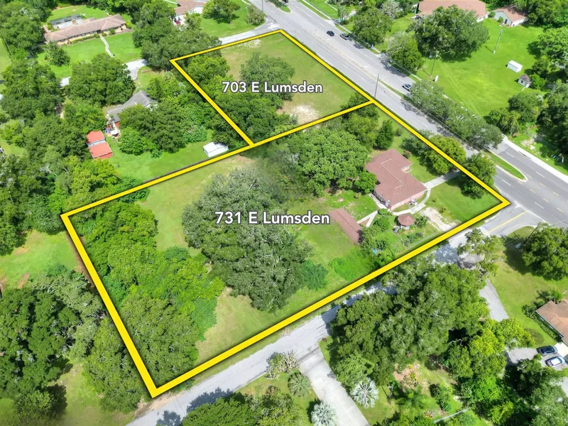 Excellent opportunity for a highly visible 2.76 acres on E Lumsden Road, which has 52,000 average annual daily traffic volume and is in the heart of Brandons medical district. This property consists of three parcel IDs and is being offered together or separately as 0.90 acres (703 E Lumsden Rd.) or 1.86 acres (731 E Lumsden Rd.). 731 E Lumsden Road features a 2,147sf home, ideal for a functional office or continued use of a home while utilizing the remaining land for a business use and parking. This site has road frontage on 3 sides, totaling 990 feet, allowing for multiple access points. This property offers a unique opportunity to develop a strategic location with flexible use options in a rapidly expanding market. The current zoning is RSC-2 with a future land use of RES-4, allowing for a variety of development options including neighborhood commercial, office, multi-purpose, or mixed-use projects. This is an extremely convenient location, catching commuting traffic heading into Tampa, just 4 miles from the Selmon Expressway and 4 from the I-75 on ramp.