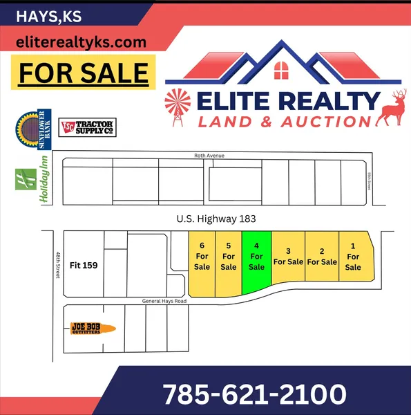 Searching for a site to fit your next or first business endeavor? Do not look past this opportunity to own acreage right along Hwy 183 just 1+\- mile North of where Hwy 183 meets Interstate 70 and Hays’ primary commercial retail area. 6 lots are available ranging from 2.5-2.9 Acres in size. General Hays Rd to the East offers off-highway accessibility while this property still allows you to reap the benefits of the Hwy visibility. Contact Nathan Goetz at 785-672-3246 or Mark Ottley at 785-623-1400 today for more details!!!!