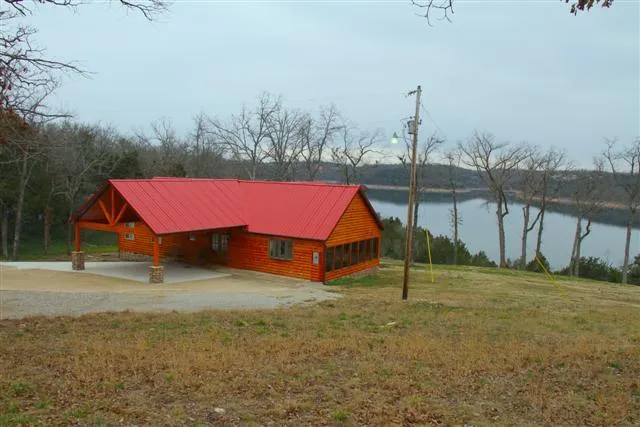 Panoramic view of Mallard Point and Lake Norfork on the Government Strip. Log and wood sided home has large covered deck, hardwood floors, open living room, wood burning fireplace, carport and separate garage/boathouse.