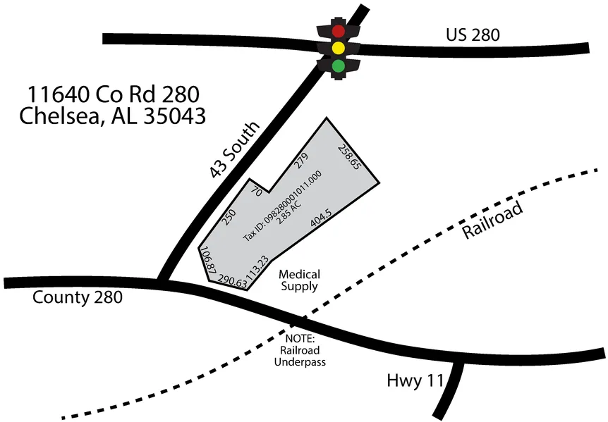 Corner 2.85 Ac m/l at Co. 43/Co. 280. Frontage co. 43 - 529 ft m/l. Frontage co. 280 - 396 ft m/l. Highly visible from US 280. Easy access pattern. Utilities: Public water - Sewer - Natural Gas. Level. City Chelsea zoning B-2. Rental home (month - month) lease (and abandoned house on property. Sold as is. No warranty for houses. VALUE IN LAND ONLY.