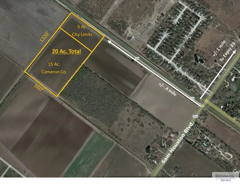 Nice 20 acre block of irrigated farmland. This tract of land is only accessible down the drainage canal right-of-way. This same right-of-way access is labeled Pennsylvania Ave. on Google Maps so that is what I used for this listing. This land is not being sold as a homesite because it lacks all-weather road frontage, city water, and city sewer. The northern 5 acres of this land are in the city limits of San Benito, and the remaining 15 acres sit in Cameron County (see photos for an aerial diagram.) The land has ag exemption so the taxes are very low.
