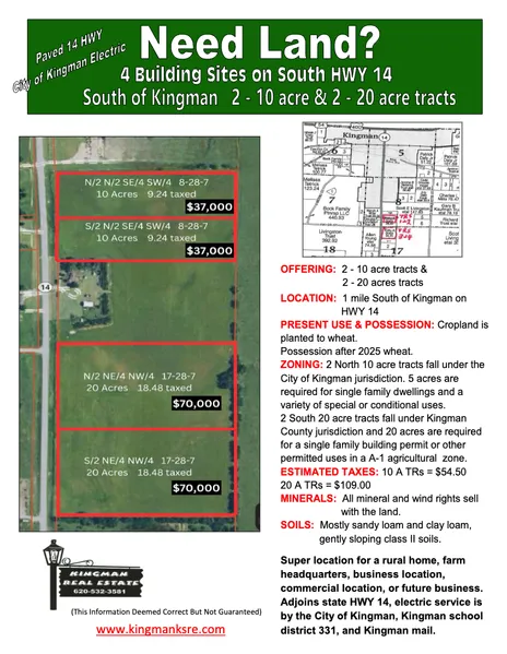 2 South 20 acre tracts fall under Kingman County jurisdiction and 20 acres are required for a single family building permit or other permitted uses in a A-1 agricultural zone.