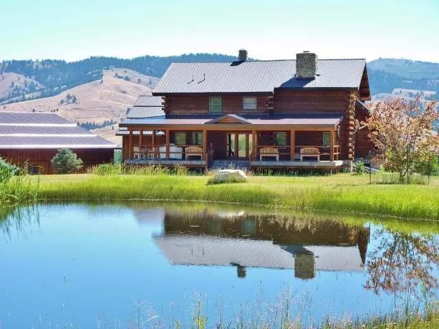 Beautiful log home using hand peeled full length logs. Much newer than year built of 1981 indicates with the foundation started in 1981 but the home was finished and move in ready in 2003. Bring your airplane this 20 acre parcel has it's own air strip and a fabulous 2010, 60' wide x 44' long hangar, or will make one heck of a nice building for toys, shop, man cave, you name it. There also is a very large 35' wide x 42' long garage that can fit up to 6 cars and still room for the nice built in work bench/shop area. There is an upstairs in the garage that makes for outstanding storage or is designed to be finished into a guest apartment. Adjacent to USFS for excellent hunting, hiking, snowmobiling, 4 wheeling, or riding the horses without having to put them in the horse trailer. The large covered back deck overlooking the landscaped pond is perfect for relaxing out of the sun. A few home features: rock wains coating around the house, vaulted ceiling in living room in a great room design with full floor to ceiling native rock fireplace with fan system, nice kitchen with hickory cabinets, Corian counter tops, Jenn-Aire grill, tile floors, nice master suite with jetted tub, dbl head glass and tile shower, loft office area, mud/laundry room, lower level with family room, an office designed with outside entrance and more nice storage. Two water wells and great water rights from Chaffin Creek with gravity flow irrigation and a spring on the property. Beautiful views good privacy yet only 4 miles from Darby. Come check out this well planned out and maintained property you won't be disappointed