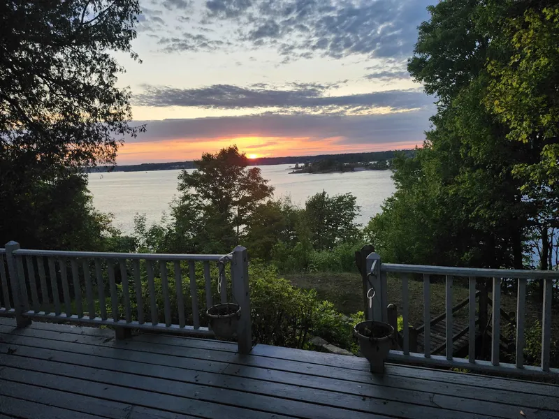 Experience the perfect blend of riverfront elegance and artistic charm in this stunning contemporary home overlooking the Saint Lawrence River. Built in 1990 and thoughtfully updated, this property offers panoramic water views, a private tram that carries you down the hillside to a deep-water dock, and a shoreline ideal for swimming and boating. View the 3D Tour with this link Inside, the home welcomes you with a sunlit living room featuring hardwood floors, beamed ceilings, and dramatic floor-to-ceiling windows that frame the river. The kitchen is spacious and functional, offering ample cabinetry, generous counter space, and a built-in dining area that makes entertaining effortless. Upstairs, the primary and second bedrooms both enjoy breathtaking views, separated by a cozy reading and napping nook. The large bathroom includes a jetted corner tub, a separate shower, and a vanity with abundant counter space and storage. A second full bathroom is located on the main floor, along with a rear entry that houses the laundry area and additional closet space. The exterior is equally impressive, with a large garage and plenty of paved parking. Above the garage, a fully equipped guest suite includes a kitchen, full bath, living room, and bedroom—ideal for visitors or potential rental income. The surrounding gardens are filled with artistic touches, creating a peaceful and inspiring outdoor environment. Recent upgrades include a new septic system installed in 2020 and a new roof added in 2021. This property is more than a home—it's a lifestyle. Whether you're seeking a year-round residence or a seasonal escape, this riverfront retreat offers luxury, privacy, and a deep connection to nature.
