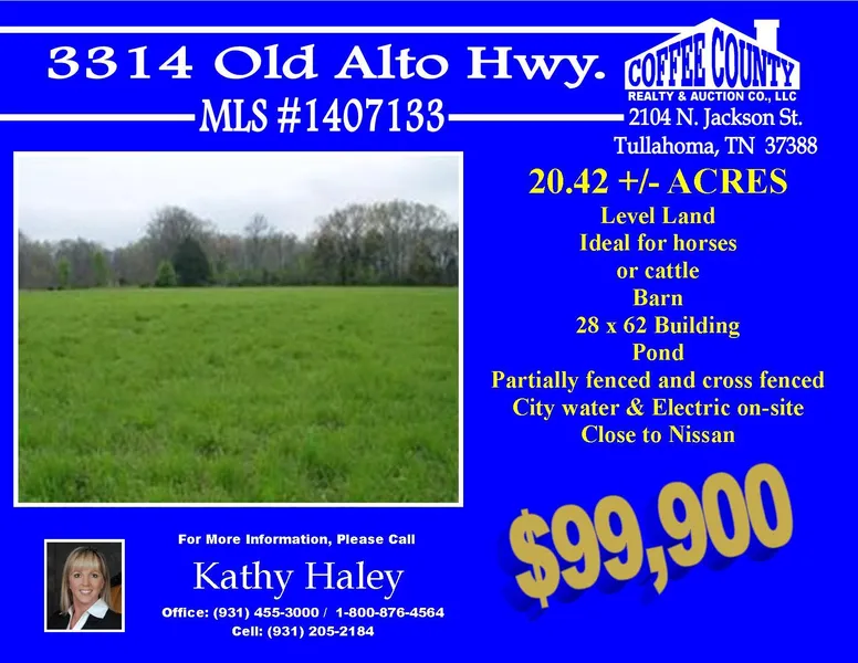 20.42 +/- acres of level land. Ideal for horses or cattle. Property has barn, 28 x 62 building, pond. Partially fenced and cross fenced. City water and electric on-site. Close to Nissan. MLS #1407133