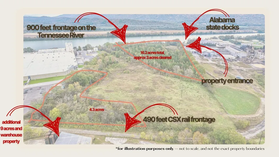First right of refusal contract in place. Exceptional opportunity to own a versatile riverfront property in the heart of the South, offering endless possibilities for commercial, industrial, and recreational development. Located in historic Bridgeport, AL, a former Civil War hub and thriving railroad and riverport town, this property is ideal for industrial operations, transportation hubs, warehousing, commercial ventures, or mixed-use development. But that's not all-there is potential for a hunter's paradise or private retreat for outdoor enthusiasts. With an abundance of fowl and deer, this land is perfect for Airbnb rentals, hunting cabins, or an exclusive getaway for nature lovers looking for a serene escape. The 900 feet of river frontage make this a prime location for a Fisherman's Haven offering fishing, boating, and water recreation. With a TVA permit, you could build a fishing pier, private dock, or cabana. Strategic Location - Just minutes from South Pittsburg, TN, and nestled in the northeast corner of Alabama, the property is easily accessible via US Hwy 72 and State Road 277, and within driving distance of several major Southern cities -- Atlanta, Nashville, Huntsville, Chattanooga, and Charlotte. The property has 490 feet along the west side of the CSX Railroad line, and the Alabama State Dock (use permit required) is only 500 feet from the property entrance on Garner Road, offering seamless transportation connections and a convenient hub for freight, barge, and commercial transportation. Utilities available: water, electricity, natural gas, and sewer. Whether you're looking to expand an industrial enterprise, develop a unique commercial venture, or create a recreational retreat, this property has exceptional potential and unmatched versatility. Don't miss out on this rare investment opportunity-capitalize on the future of this incredible riverfront location!