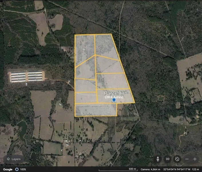 Large, beautiful East Texas property.. This listing is for Parcel H, depicted in the attached photo, and is approximately 20.6 acres along the northeast side of the subject property. The area is comprised of beautiful rolling land, some wooded area, and pasture acreage that is currently serving as the ranch home of a livestock operation raising bison and cattle. The overall property has premium fencing of 6 ft high, 6 strand wire surrounding the external boundary, with some similar internal fencing separating pastures. It encompasses the northern part of a 232 acre plat, from which ~192 acres will be divided at closing. Parcels A & B have road access at a corner to the parcel, whereas Parcels C through I, have some road frontage. The parcels can be purchased as displayed, or a larger parcel can be created by either combining designated parcels, or by negotiating custom boundaries contained within the overall acreage. The resulting parcel will be re-platted for closing. (The depicted parcel boundaries are approximated from Google Earth.)