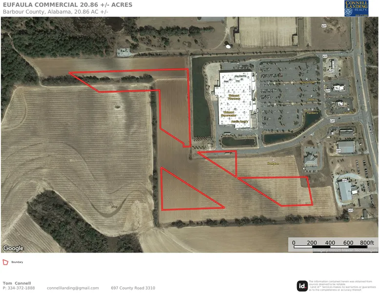 Description: 20.86 +/- acres of commercial property adjacent to and also behind the Eufaula Walmart. Some of the land is currently planted with crops. Easy access off Highway 431 and a main highway of travel for tourists going to Florida. The immediate area offers a Hampton Inn, Walmart, Murphy gas station, Zaxbys, Taco Bell, medical clinic, car wash, and Wallace Community College Sparks Campus. It would be a great development property once sewer, water, and power are established.