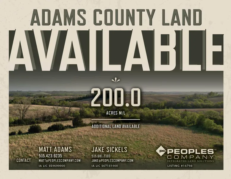 Peoples Company is pleased to offer a rare opportunity to purchase 536.6 acres m/l of Adams County combination farmland, offered in 4 tracts ranging from 66.6 to 200 acres m/l, located just west of Prescott, Iowa. These tracts include a wide variety of attributes and feature something desirable for any type of Buyer including but not limited to; well maintained and substantial income producing CRP acres, heavily timbered draws, and cover, a lake, multiple ponds, tillable ground, and pasture. These farms are offered in four separate tracts but could be purchased as a turn-key unit as well, allowing a Buyer to acquire a large amount of acres in one specific area - a task that often takes decades of hard work and effort. All four of these farms have been meticulously maintained and kept up to a high standard by the current ownership.