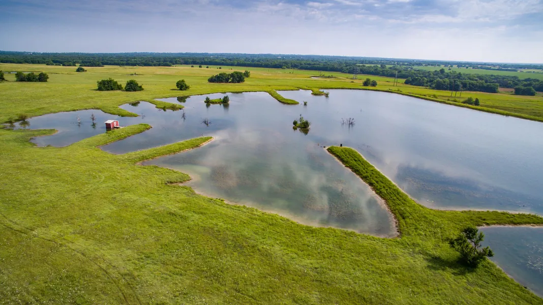 The ranch offers a variety of terrain from level to gentle sloping down to a seasonal creek area along the north and NE boundary. This area is partially wooded and offers great hunting with Turkey, Dove, Whitetail and Coyote. The ranch is under a MLD permit and the owners have only harvested management bucks and does over the last several years. The waterfowl hunting on the ranch is phenomenal with Canadian Geese, Mallard, Teal, and Wood Duck; several Canadian Geese have made the ranch home. Several Blue Herron nests can be seen in the trees at the lakes.