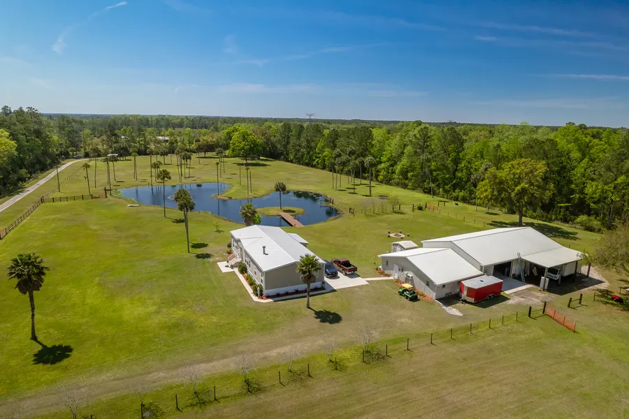 21 Acre Dream Farm - Fenced & Cross Fenced! Charming 3-bedroom, 2-bath country home & a well-equipped workshop, nestled among tall, swaying palm trees. A long, winding driveway leads you through lush, green pastures dotted w/wildflowers & mature trees, creating a peaceful, private retreat. Home features a recent metal roof, stunning open floor plan w/cozy fireplace, gorgeous kitchen & eat-in bar, plus a beautiful primary master suite. Nearby, the spacious 4,000 sq ft workshop (includes 1,200 sq ft showroom w/office) stands ready for any creative endeavor, whether its wood working, metal working, or farm equipment maintenance; featuring large roll-up doors, ample shelving, & work benches designed for efficiency. It also includes the car lift. Property is fully fenced & cross fenced. Plenty of water with 4'' artesian well for pond & pastures, along with a 5'' well for home & workshop. The large pond is well stocked w/bream & bass. Schedule your showing today.