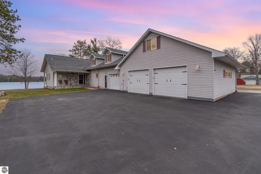 Stunning Lakefront Custom Home with Sunset Views on Round Lake! Welcome to this beautifully maintained and thoughtfully designed custom-built home, nestled on 80 feet of prime frontage on Round Lake, which connects to Indian Lake—offering over 300 acres of spring-fed, sandy-bottom waters perfect for boating, swimming, and world-class fishing. Built in 2002 and packed with upgrades, this west-facing home captures breathtaking sunset views from nearly every room. A two-level deck spans the entire waterfront side of the property, with an additional level above a spacious cinder block storage building—ideal for storing all your water toys. The lakeside covered patio features overhead lighting and ample electric outlets, perfect for entertaining or installing a future hot tub. Step inside and be greeted by a warm knotty pine cathedral ceiling, a gas fireplace, and open-concept living, kitchen, and dining areas with panoramic lake views. The kitchen boasts custom cabinetry, and brand-new carpet (2024) enhances the living room, hallway, and primary bedroom. The main floor offers two bathrooms, each with large walk-in showers with built-in seating. The spacious primary suite includes a walk-in closet and private access to the patio. A second bedroom features matching custom cabinetry, while the large laundry room offers even more storage, a counter for folding, and deep sink. What was once a single-car garage has been converted into a unique multipurpose room, equipped with a second kitchen—perfect for canning, hobbies, or entertaining. This space connects to the attached two-car garage, outfitted with commercial-grade pallet racking for ultimate storage. Upstairs, two staircases (one from the garage, one inside the home) lead to an open loft currently used as a third bedroom and office area. Beyond the loft, discover a fourth bedroom with full bath, and a fifth bedroom ideal for guest quarters, complete with a sitting area. Don't let this one get away.