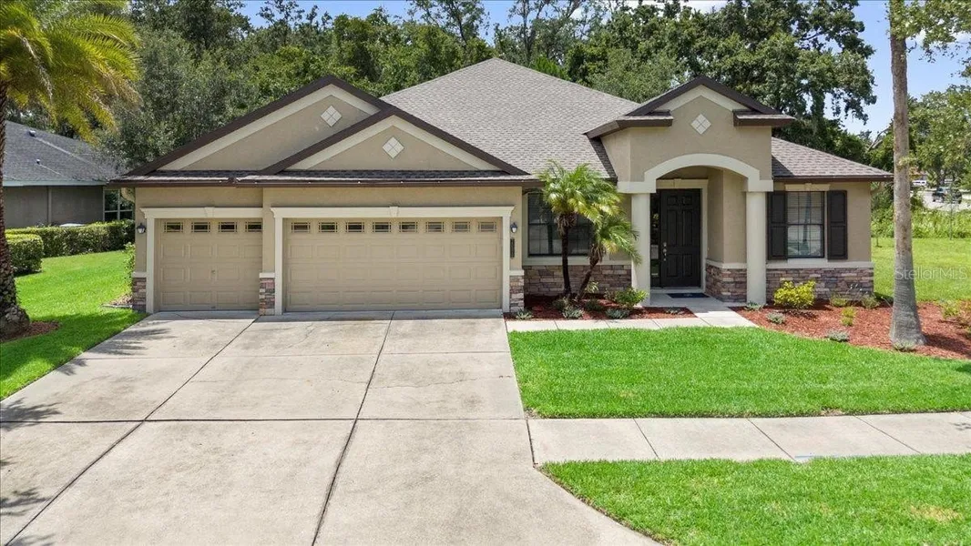 One or more photo(s) has been virtually staged. Poised on a lush corner conservation lot in the prestigious guard-gated community of Grand Hampton, this meticulously maintained 4-bedroom + office, 3-bath, 3-car garage residence blends thoughtful design with modern upgrades and captivating curb appeal. Located within walking distance to the park and basketball court, this home offers both luxury and convenience. A new roof (2025) and exterior paint (2021) ensure lasting value, while the surrounding landscape—featuring swaying palm trees and vibrant red bark mulch—sets a tone of tropical sophistication.