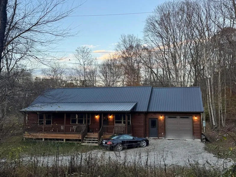 Amish-Built Cabin by Buckhorn Builders | 2 Beds | 2 Baths | 1.83 Acres with Creek Welcome to this beautifully crafted Amish-built cabin, completed in 2023 by Buckhorn Builders. Nestled on 1.83 peaceful acres with a wooded hillside and a year-round creek, this property blends rustic charm with high-quality craftsmanship throughout. Inside, you'll find an inviting open-concept layout finished in authentic knotty pine from floor to ceiling. The home features 2 spacious bedrooms, 2 full baths, a utility room with sink, and a walk-in pantry for convenience. Custom details are everywhere from the premium cabinetry and solid wood interior doors to the handcrafted trim and custom flooring that showcase the builder's attention to detail. The attached 1.5-car garage provides ample space for parking or storage. Step outside onto the large front deck, perfect for relaxing and enjoying the serene setting. The exterior boasts 1 4 saw log siding, leaf-filtered gutters, and timeless curb appeal that fits perfectly in the Hocking Hills countryside. Whether you're seeking a peaceful primary residence or a potential short-term rental investment, this cabin offers a blank canvas ready for your vision. The location and natural surroundings make it an ideal getaway destination or cozy year-round home.