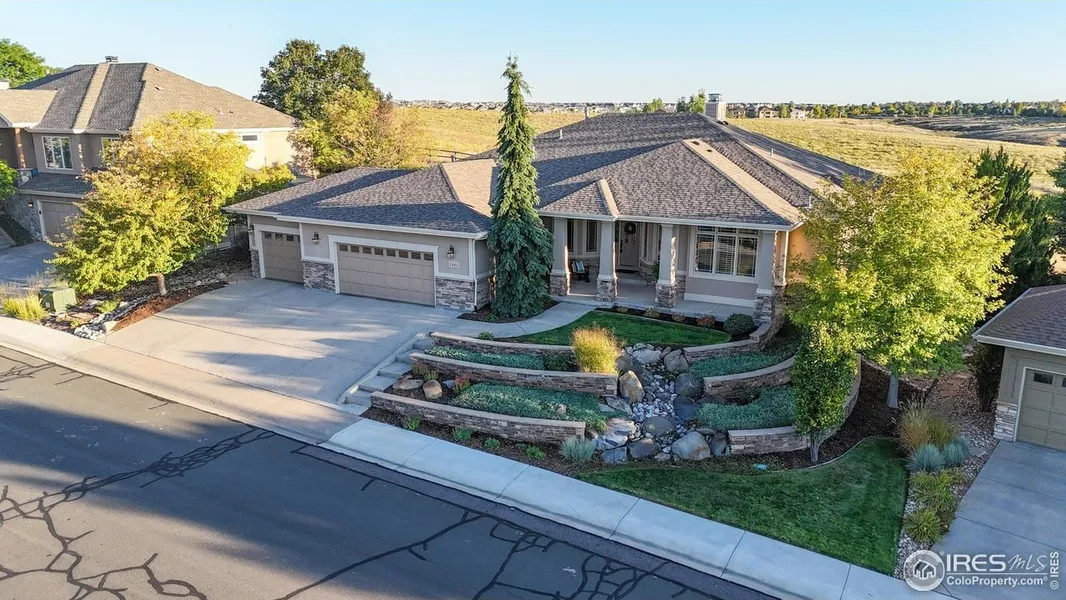 Absolutely stunning 5-bedroom ranch-style home on open space in Windsor's coveted Bison Ridge neighborhood! From the moment you step into this beautiful retreat, you'll appreciate the design and craftsmanship. Take in the wood floors, high ceilings, two fireplaces and large south-facing windows flooding the great room, family room, kitchen and dining areas with abundant natural light. The spacious gourmet kitchen features beautiful cabinetry, a large island and granite countertops. Three bedrooms on the main level, including a jack and jill bath and a sprawling primary suite with large windows, luxury bath with walk-in shower, soaking tub and walk-in closet. In the finished basement, you'll find a large recreation/media room, temperature-controlled wine cellar, two bedrooms, two bathrooms, an office and more flex space or non-conforming 6th bedroom. You'll relax and entertain in style from your covered patio nestled against private open space with mountain views. Sit by the water feature, soak in the classy (included) hot tub, or enjoy peaceful sunrises and beautiful sunsets. This home is meticulously cared for, with a new furnace, AC, and water heater. Oversized three-car garage. Blending style and functionality, this home provides the ideal balance of luxury and everyday comfort near all the services this amazing community has to offer.