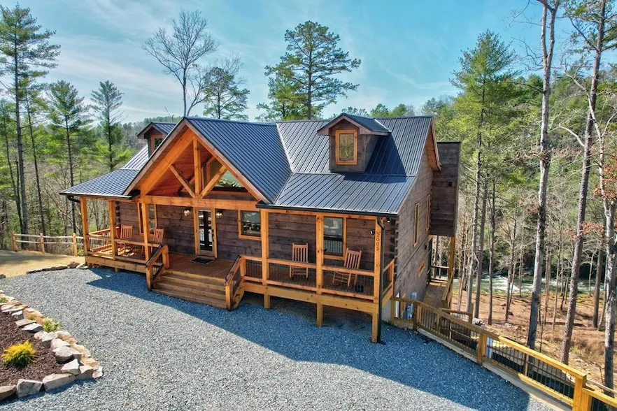 Welcome to Twisted River on the renowned Mountaintown Creek, a trophy trout stream in western Gilmer County. This rustic and earth-toned themed cabin sits on over 3 acres that has been professionally underbrushed and landscaped. As you enter into the modern kitchen from the covered, rocking chair style front porch, you'll find stainless steel appliances, granite countertops, a sit-at island, and rough sawn wood cabinets. The cozy living area features a floor-to-ceiling, stacked stone, gas log fireplace, large picture windows, and exposed beams in the vaulted ceiling. The main level also has a primary en-suite on one side and a guest bedroom and bathroom on the other side, both rooms facing the roaring creek below (pop open those windows and just listen), main level laundry, and a fully screened-in back deck with a stacked stone fireplace. Down the stairs to the terrace level you'll find a "flex room" that can be used for an office or additional sleeping space, a game room area with a wet bar, and another en-suite, as well as terrace-level laundry (two laundry spaces). Step onto the lower level, screened-in deck and relax in the hot tub or take a hike down to the creekside via the professionally fashioned stair pathway and trail. The property also features a whole home generator as well as a Tesla charging station. The lovely furnishings can be purchased on a separate bill of sale. High River amenities include a riverside clubhouse and park with a fire pit and walking trail, other creekside and lakeside parks with pavilions, Lake LeCroix access, a canoe launch, and more nature trails. All paved access with a 10-15 minute drive to downtown Ellijay where you'll find boutique shopping, fine dining, and so much more. Enjoy the nearby wineries, orchards, and Carters Lake.