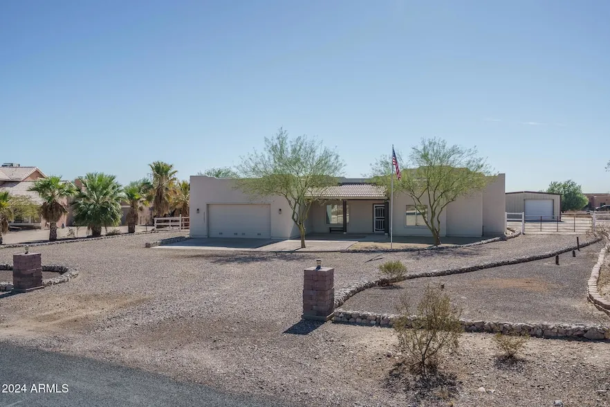 Welcome to this beautiful home on over an acre of land! Enjoy mountain views from your front patio and a new AC unit replaced this year! This home features 3 bedrooms, 2 bathrooms, updates throughout, and an open great room layout. You will love this stunning kitchen with granite countertops, stainless steel appliances, and a kitchen island with a breakfast bar. The soft neutral tones and elegant wood-look flooring throughout the home create a clean, cohesive aesthetic .The primary suite is spacious with an ensuite featuring dual sinks, a soaking corner tub, a separate shower, and a huge walk-in closet! The remaining 2 bedrooms have walk-in closets and ceiling fans. The laundry room has added upper cabinets for additional storage! The private backyard is fenced and offers an extensive covered patio with extensions. Enjoy easy care landscape with artificial grass. Beyond the back gate you will find a huge yard with plenty of room for horses and a 24X35 Insulated metal workshop/garage generator attached! Additional features include lifetime sunscreen film applied, insulated garage, gutters, Security doors on both patio doors, and pull-out shelves in kitchen. Do not miss out on this home!