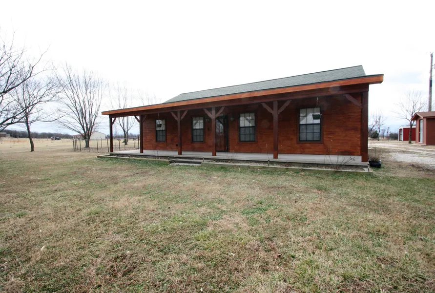 Turn-key Ozark mini-homestead on 5 acres +/- w/ full perimeter fencing, pasture, corral. Single story ranch w/ open living/dining/kitchen, easy care stained concrete floors & vaulted ceiling. Covered front porch & rear patio. Young orchard planting features peach trees and a variety of apple seedlings. Future nut producers include established black walnut and pecan seedlings. Nearly new in-ground storm shelter. Shared access to the small fishing pond at SW corner of the property.