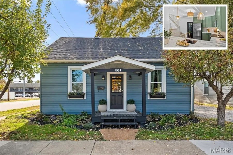 This stunning residence has undergone a full-scale, luxury renovation with no detail overlooked. The main level features new flooring and fresh paint throughout the light-filled living room, seamlessly connecting to an elegant, fully upgraded kitchen. The kitchen showcases on-trend custom-painted cabinetry, stainless steel appliances, a chic tile backsplash, brass hardware and fixtures, and modern lighting. A stylish barn-style sliding door leads to the main-floor laundry for added convenience. The main level primary suite offers a true retreat, complete with a custom pass-through closet and a beautifully appointed ensuite bath featuring a glass-enclosed walk-in shower and dual vanity sinks. A fully remodeled guest bath is also located on the main level for added comfort. Upstairs, you'll find two well-appointed guest bedrooms, perfect for family or visitors. Outside, a covered patio provides an ideal space for entertaining and overlooks the fenced backyard with storage shed. This home blends historic charm with modern luxury—an exceptional opportunity to live in one of O’Fallon’s most desirable locations.