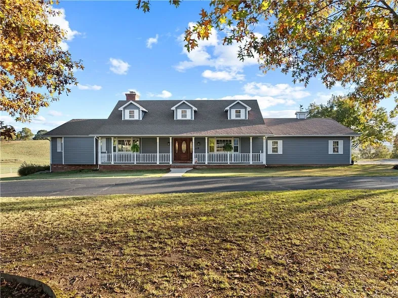 This stunning executive-style home in Harrison, AR, near the Buffalo National River and just 30 minutes to Branson, MO, offers luxury housing 77 picturesque acres. The chef's dream kitchen features granite counters, Frigidaire commercial-style stainless steel appliances, a gas range, wall oven, and custom cabinets with smart features for seamless meal prep. With 6 bedrooms and 5.5 baths. The home is ideal for multigenerational living, including a second full kitchen, 2 bedrooms, and 2 baths in the basement with ensuite baths. Two wood-burning fireplaces, one ducted into the HVAC system for added winter energy efficiency. Enjoy sunsets over the Ozark Mountains from the deck, and raise livestock on the 77 acres. You can store your RV in the red barn with 14-ft. doors for direct pass through. Located just outside the city limits, this home is only 2 minutes from the Creekside Regional Community Center, making it a perfect blend of rural serenity and modern convenience.