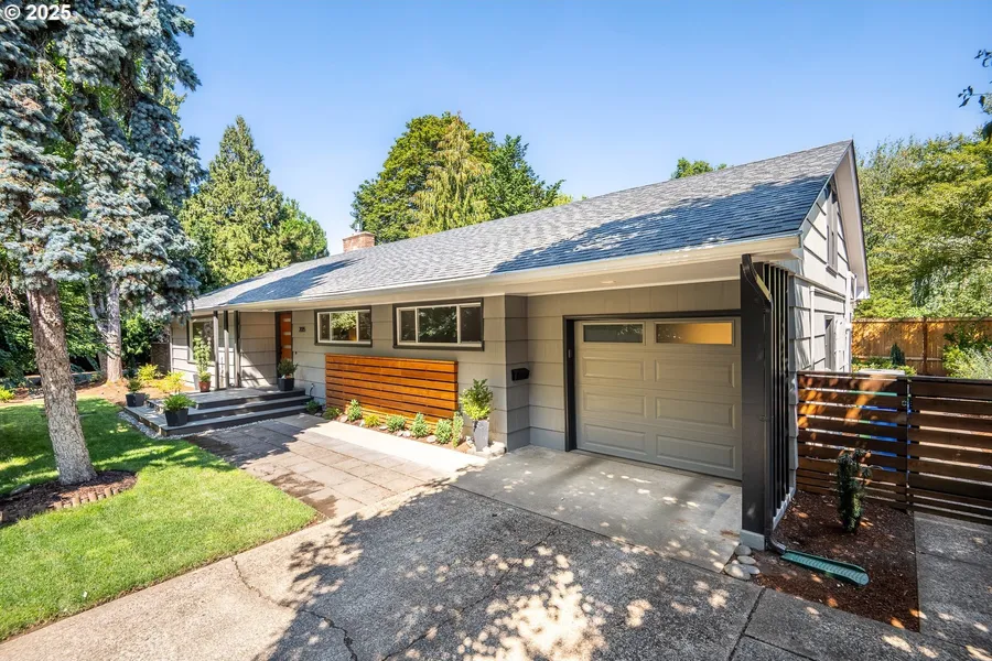 Discover timeless design and modern comfort in this stunning 1952 Mid-Century Modern home, ideally situated on a quiet corner lot between Eugene Country Club and Oakway Center. The open floor plan highlights original refinished wood floors, a cozy new gas fireplace, and a spacious updated kitchen with stainless steel appliances. French doors open to a large entertaining deck overlooking the beautifully landscaped backyard. Thoughtfully remodeled throughout, this home now features an overhauled laundry room with abundant built-in storage, offering both functionality and style. Additional recent upgrades include a new front door, blinds throughout, updated bedroom closet doors, and fresh interior paint. Exterior improvements include newer paint, new gutters and downspouts with leaf filters, new fencing around the backyard, full landscaping with a drip irrigation system, wired for Xfinity home security w/ cameras and selective tree removal for added light and space. Enjoy year-round efficiency with a tankless water heater and a newer HVAC system. A versatile bonus or storage area above the garage provides extra flexibility. Perfectly located near golfing, dining, and shopping, short jaunt to Autzen Stadium, and just a short golf cart ride to Eugene Country Club. This home offers the ideal blend of elegance, convenience, and classic mid-century charm.