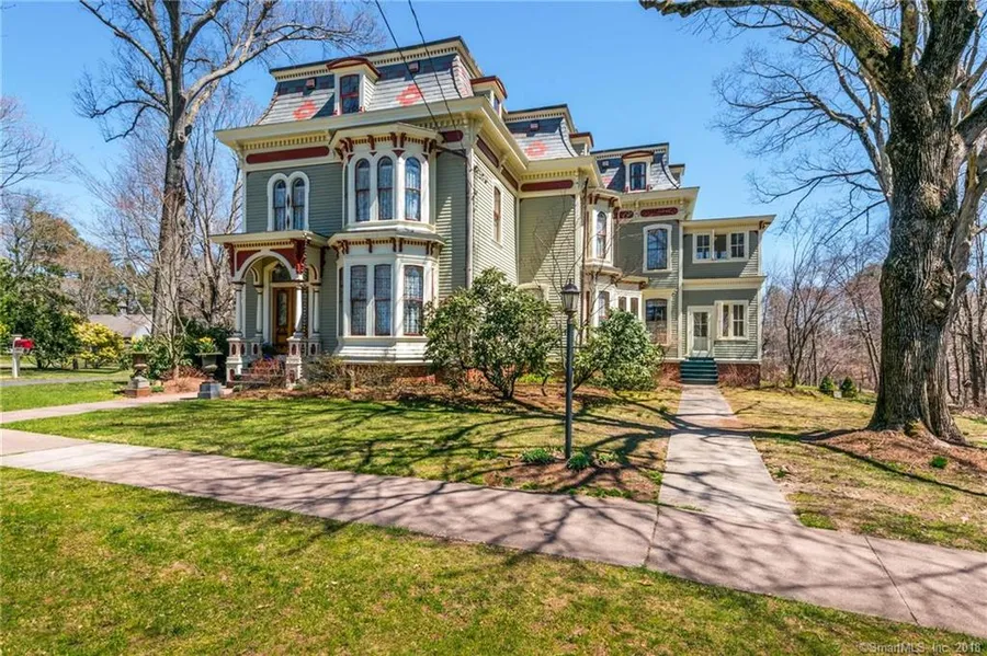 Welcome to one of Glastonbury's most well known historic Main Street estates. This lovingly restored French Second Empire residence is sited on nearly four acres of park-like grounds featuring beautiful gardens, a large three-car barn with second floor and a patio with outdoor fireplace overlooking Hubbard Brook. This prime Main Street location is less than a mile from Glastonbury Center's fine dining, shopping, the Connecticut River and more! The juxtaposition of original details from the 1870s with modern updates will compliment any lifestyle. Original details include the oak floors found throughout the main and second floor living areas, canvas drop ceilings, three marble and two brick fireplaces, the baseboard, crown and other interior molding and much of the hardware. The first floor features a formal Living Room with marble fireplace facade and French doors to the formal Dining Room with marble fireplace and coffered ceiling. The updated Kitchen features granite counters, center island, breakfast porch, marble fireplace and a butler's pantry/baking kitchen. Also on the main floor are the large modern Family Room at the rear of the home, Den with fireplace and a Home Office also with a fireplace. The second floor Master Suite comprises four rooms; Bedroom, Dressing Room, Napping Porch and a modern bathroom with soaking tub, walk-in shower and double vanity. The 1300SF (+/-) third floor features two bedrooms, a recently remodeled bath, a rec room and a kitchen.