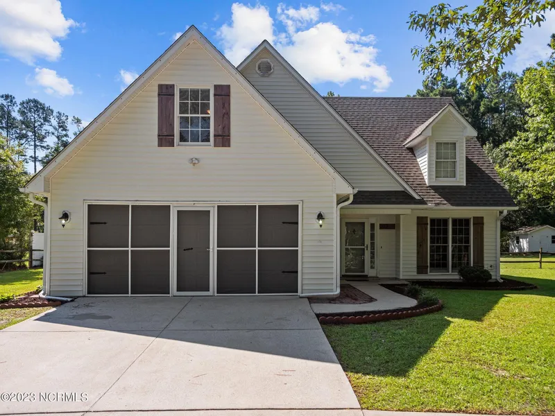 Here is your Havelock diamond in the rough!! This 4-bedroom, 2 1/2-bathroom, 2-car garage sits on a quiet and peaceful 1.31-acre parcel in the highly desirable Cherry Branch West subdivision. Pull down the long driveway and notice the professionally landscaped grounds along with the additional parking space for extra vehicles. You'll also see the additional screened wall/doorway on the garage that helps transform garage space into a gym or additional living space as desired. This screened wall/doorway does not impact the operation of the garage door and can be removed if needed. Walking through the front door you are greeted with an open and airy feel from the vaulted ceiling. The formal dining area is off to your right and adjoins the kitchen. The eat-in nook is open to the kitchen and the large living area making for perfect space for entertaining friends and family. The kitchen is appointed with stainless-steel appliances, ample cabinet space, and a sizeable pantry. Out back you will find the 15x18 screened-in porch that leads out to the huge fenced backyard. The backyard also includes a shed and a playset. The yard continues well past the fenced area and the property goes even further back into the woods. The property is very private. Back inside, the half bath and laundry area and the primary owner's suite are located on the main level. The owner' suite includes a walk-in closet and a fully equipped en suite. The three guest rooms are upstairs along with the guest bathroom. The community offers many amenities to include a clubhouse, two swimming pools, tennis courts, a basketball court, Neuse River, horse stables, and beach access and water access for small boats and kayaks. Make your appointment today as this one will not last long.