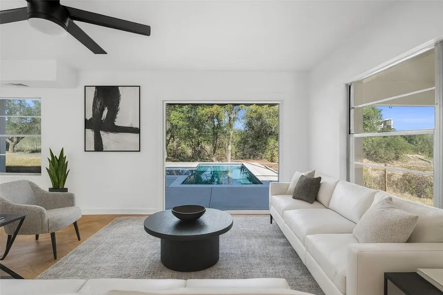 Discover the perfect blend of location and relaxed lakefront living in this completely reimagined lakefront home. Nestled on just over an acre and framed by majestic Live Oak trees, this property offers over 240 feet of pristine Lake Travis waterfront in a peaceful cove - ideal for fishing, floating, or simply unwinding by the water. Enjoy breathtaking views from both the upper and lower decks, or take a gentle stroll down the sloping path to the shoreline. Outside, the pool invites you to cool off or lounge lakeside in true resort style. Recently renovated, this home blends thoughtful design, refined finishes, and timeless Hill Country character. The property features irrigation from the lake as well as a reliable private water well, offering the best of both worlds. Just ten minutes from local restaurants and grocery stores and close to all area schools, this residence is perfect for full-time living or a weekend retreat.