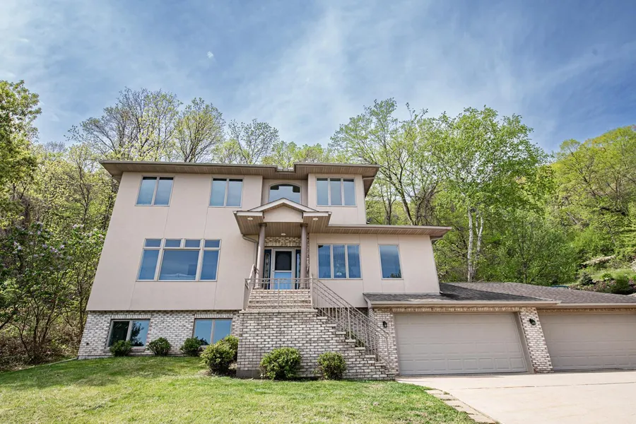 This immaculate home has everything you could hope for. In superb condition and located in quiet area with adjoining platted, wooded lot. Magnificent views all the way to WI bluffs across the river. Open floor plan with kitchen island, living room, family room with fireplace, den (or extra bedroom), both informal and formal dining, half bath on the main level. Walks out to private deck, extending the whole width of the home. Upstairs has bedroom suite with private bath with shower and jet tub, walk-in closet. Two more bedrooms and full bath. Lower level has newly done huge family room with snack and bar area. Additional den/office and full bath. FOUR car garage! Very reasonable price for the special home!