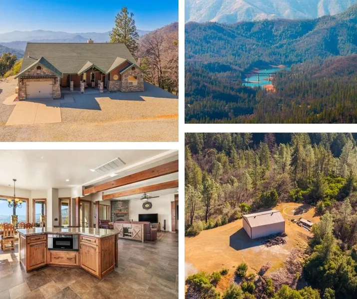 Stunning mountain retreat nestled on nearly 28 acres offering unparalleled views of serene beauty overlooking Shasta Lake's Salt Creek Inlet. Featuring 2,500 sq. ft. of open-concept living, this spectacular home was thoughtfully designed with high-end finishes and craftsmanship throughout. Boasting 10-foot ceilings, 2x6 construction, dual HVAC units and gorgeous wood beams with transoms that enhance the airy feel. The space includes 3 bedrooms, 2 luxurious bathrooms, large game room with a pool table and upgrades at every turn. From granite countertops and stone tile flooring to custom knotty alder cabinetry and floor to ceiling rock fireplace this home will not disappoint. Featuring a grand primary suite and secondary suite, each with its own covered patio, one featuring spa-like master bath with jetted tub and an oversized tile shower with dual shower heads. The expansive property includes an attached garage plus detached 30x40 shop ideal for storing RVs and boats plus there is also a large helipad for convenient access to this spectacular retreat. Detached RV carport, Generac generator and covered patios for outdoor enjoyment and furnishings are even available! There's even a 100 yard gun range and is conveniently located between two boat ramps for easy access to the lake! Whether you're looking for a full-time home, a second getaway, or an income-producing vacation rental, this property is a true gem. Embrace the peaceful solitude and luxurious amenities this home has to offer!