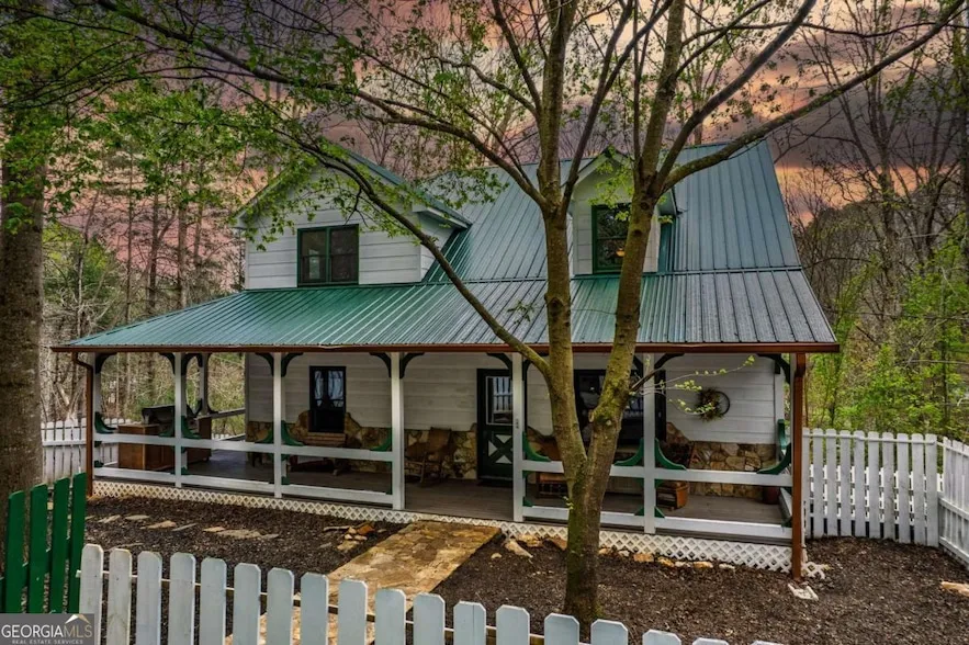 Nestled on a secluded three-acre lot, this unique mountain property offers charm, privacy, and versatility. The main home, a three-bedroom, three-bath cabin, features soaring beamed cathedral ceilings that create a spacious and inviting atmosphere. The open-concept layout flows seamlessly into the kitchen, which includes a pantry, dining area, and direct access to the back porch and garden. The master suite on the main level connects to the laundry closet and a sunroom, providing a peaceful retreat. The fenced one-acre backyard is a nature lover's paradise, featuring a diverse collection of trees and plants from around the world. A stunning 22-foot waterfall cascades between two koi ponds, offering a serene setting for relaxation and reflection. Upstairs, a large loft with expansive windows includes a bedroom and bathroom, while the finished basement offers a family room, an additional bedroom with a private entrance, a bathroom, and a workshop. Both the loft and basement have the potential to be used as separate in-law suites, making this home ideal for hosting guests or generating rental income. A detached one-bedroom, one-bath guest house, built in 2010 and spanning additional 554 square feet, currently produces $800 per month in rental income. The lease can be assumed or terminated at closing. Additional features include a generator and a garden pavilion that can accommodate a hot tub. Located in the pristine Coosawattee River Resort, this property offers access to a variety of resort amenities and presents an excellent opportunity for a primary residence or an investment with both short- and long-term rental potential.
