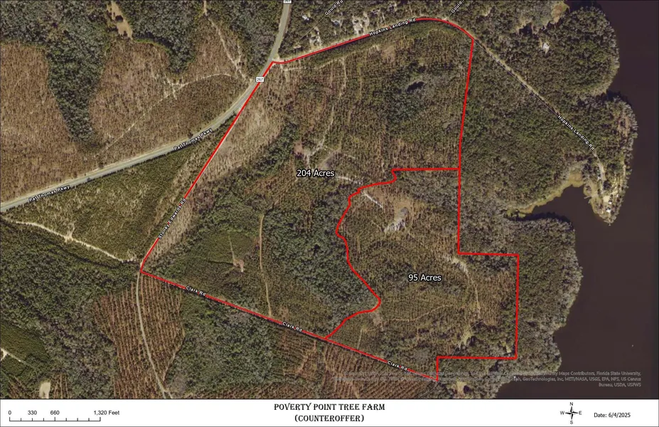 For the first time in over 40 years, Poverty Point is being offered for sale. Approximately 204 acres are offered at $5,950/acre. The acreage includes approximately one-half mile frontage on public Hopkins Landing Road, approximately 0.13 miles of frontage on Pat Thomas Parkway (highway 267), approximately one-half mile frontage on private Stoney Edwards Road, and approximately one-half mile frontage on private Clark Road. The purchase of 204 acres also includes the right of first refusal to purchase the balance of approximately 95 acres, which has highly valuable timber, frontage on Lake Talquin, a home, and several outbuildings. The 204 acres include approximately 114 acres of 40-year-old planted loblolly pines, approximately 26 acres of 30-year-old planted longleaf pines, approximately 58 acres of hardwood timber, and approximately 6 acres of food plots. Imbedded in the hardwood areas are two natural duck ponds and three drainage areas that ultimately combine to eventually flow into Lake Talquin. The property also lies directly adjacent to a portion of Lake Talquin State Forest fronting Lake Talquin and seldom, if ever, trampled upon by human foot. This essentially expands your ownership by over 100 acres and expands connectivity by thousands of acres.