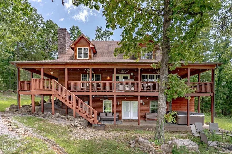 Welcome to Market 205 Cooper Kate Trl of Norfork, AR. Nestled on 20 +/- wooded acres off of Hwy 63 is a log cabin wrapped in stone & cedar, topped w/ architectural shingles and accented by a wrap-around deck, and covered patio. The interior features 2800 +/- sf of well laid out living space that contains an open concept living/kitchen/dining area. The living room holds a soaring wood ceiling, wood burning fireplace with stone surround and access to the deck. The eat-in kitchen contains granite countertops, bar seating, stainless steel appliances and pantry. The Master is on the main and has deck access, a walk-in closet, jet tub, and custom walk-in shower. Upstairs you'll find a spacious landing, guest bedroom, guest bathroom w/ shower/tub combo, and an office. The finished walk-out basement features a full eat-in kitchen, living room, guest bathroom w/ shower/tub combo and access to the patio. You'll love the panoramic mountain views from almost every room, that the property sleeps 12 comfortably, the bonfire pit, and the 40 x 40 floored & wired shop. Conveniently located 5 minutes from the White River and 10 minutes to Norfork Lake. Furnishings are negotiable. Call today to schedule your tour and make this house your home, home away from home, or next addition to your rental portfolio.