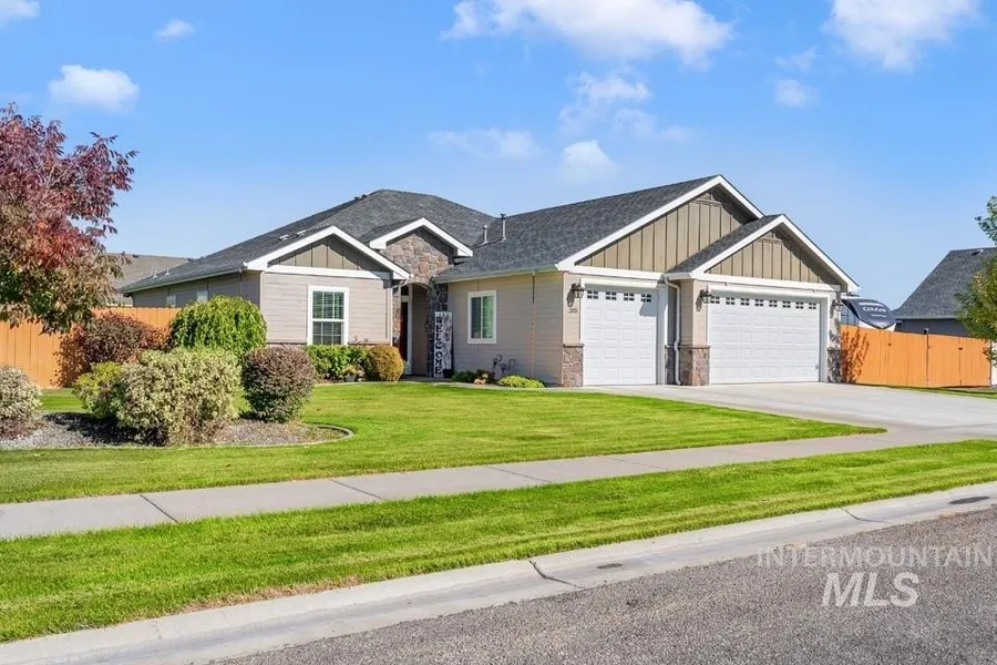 Immaculate 1,808 sq. ft. home situated on a beautifully landscaped 0.31-acre lot in the highly sought-after Pleasant Loop Subdivision! This stunning 3-bedroom, 2-bath residence also features a spacious office that can easily serve as a 4th bedroom, home gym, or flex space. The open-concept floor plan is warm and inviting, highlighted by rich finishes and thoughtful design throughout. The gourmet kitchen is equipped with granite countertops, custom cabinetry, a raised breakfast bar, gas range, pantry, and abundant storage, perfect for everyday living or entertaining guests. The luxurious primary suite includes a large walk-in closet with custom shelving and a spa-inspired bath with dual vanities and a beautifully tiled walk-in shower. The second bathroom offers built-in linen storage for added convenience. Step outside to a covered patio overlooking a fully fenced backyard with mature landscaping, garden boxes, automatic sprinklers, and a drip system. Additional features include RV parking, a large custom shed with loft storage, and an oversized 3-car garage that is fully insulated, has epoxy floors and climate-controlled with its own mini-split system, ideal for hobbies, a workshop, or year-round use. Located within walking distance to schools, parks, and shopping. This move-in-ready home is impeccably maintained and loaded with upgrades throughout!