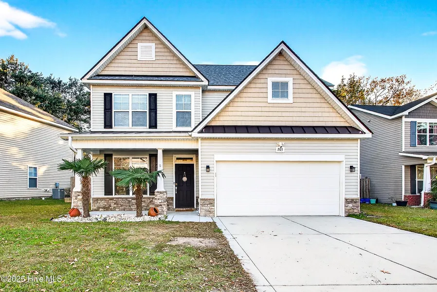 Just in time for the Holiday's!! Welcome home to this established neighborhood at Peggy's South Bridge. This stunning home is a rare find with 5 bedrooms and the primary suite is on the first floor living area. When you walk into the foyer you have built in storage for your convenience. Off the foyer is the laundry room on the right and a formal dining room with coffered ceilings on the left. Through that room is a stunning recently remodeled Kitchen. New Quartz Counter Tops. New Tile backsplash, New Stainless undermount sink and cabinet hardware freshly painted cabinets, under counter dimmable lighting with Stainless Steel Appliances. and New Lighting fixtures Recently Updated LVP seamless flooring downstairs except the primary suite. The living area is spacious with nice high ceilings, electric fireplace with craftsmen wood work and shiplap. The best part is the primary living suite is downstairs has trey ceilings with an on-suite a walk-in closet dual vanities soaker tub and Walk-in shower. Outside the primary suite is an updated half bath. Then heading up the steps you have 4 nice size bedrooms 2 with walk-in closets. A full bath in between the bedrooms with dual vanities. Plenty of storage space in this home. Out back you have a peaceful backyard setting with a covered patio with a fan for those hot NC evenings. A beautiful deck with permanent Govee lighting plenty of seating for those backyard BBQ get togethers. Out front you have a covered porch and permanent Govee lighting as well. This home has so much to offer. 10 minutes to the pristine beaches of Topsail Island. Close to Shopping and Restaurants of the every growing Sneads Ferry area. Minutes to the back gate or MARSOC. Roof was done in 2024, HVAC in 2022. Water Heater 2023 peace of mind for the new home owner. Don't hesitate to book your private showing today!!