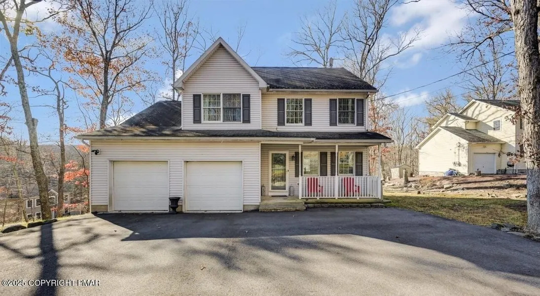 TRADITIONAL COLONIAL CHARM MEETS MODERN COMFORT! Welcome to this updated 3BD/2.5BTH Colonial with paved driveway and 2 Car Garage situated on a quiet, tree-lined corner in gated, amenity-filled Saw Creek Estates! Step inside to a bright and inviting interior featuring fresh paint, updated floors, sparkling chandeliers, and stylish hardware throughout. The Living Room centers around a sleek electric fireplace, creating a cozy yet contemporary atmosphere. The Kitchen is well-appointed and boasts ample cabinetry, granite countertops, tile flooring, a mosaic tile backsplash, and a breakfast bar illuminated by pendant lighting. Just beyond, the Family Room features a wood-burning fireplace, beautifully accented by a tile and wood surround-an ideal space to gather. Upstairs, find spacious bedrooms with double and walk-in closets. The Primary Suite includes a walk-in closet and a private bath featuring a jetted tub with tile surround, double vanity, and separate shower. Enjoy outdoor living at its best with a covered front porch--perfect for morning coffee, and a back deck where you can relax with Family and Friends. Features Central A/C, public water/sewer and an unfinished basement providing potential for added living space. HOME INCLUDES A 1 YEAR AMERICA'S PREFERRED HOME WARRANTY TO THE NEW BUYER AT CLOSING! Saw Creek Estates residents enjoy resort-style amenities with indoor/outdoor pools, activity rooms and sports courts, fitness facilities, playgrounds, community skiing, a restaurant and year-round recreational activities-all surrounded by the natural beauty of the Pocono Mountains. Minutes to community amenities, major roads, local attractions. SCHEDULE YOUR APPOINTMENT TODAY!