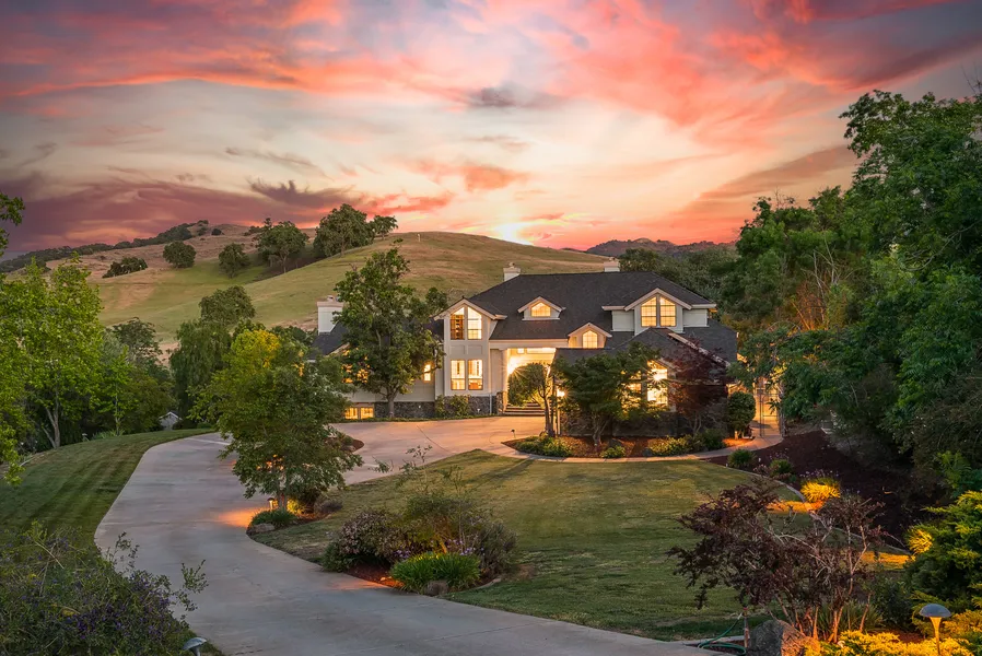 Lovely manicured front landscape surrounds the motor court leading to the front double door entry. Inside, large picture windows showcase the expansive living space and the golden hills just beyond! Enjoy volume ceilings throughout the spacious rooms of this well-designed floor plan of 5 bedrooms including two on the main floor, 3 full bathrooms and a powder bath.