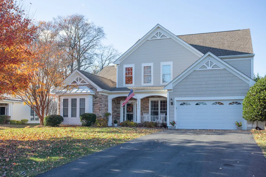 A welcoming stone façade and covered front porch set the tone, opening to a bright two-story foyer and a versatile first-floor office with French doors—perfect for working from home or a quiet front sitting room.