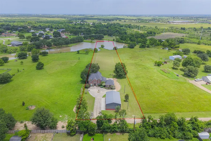 Experience peaceful country living on this stunning 2-acre property with a private road featuring a lake and an impressive 30x50 barn/workshop with 16’ ceilings. Step inside to a grand 2-story tiled entry that opens to a formal dining room with elegant crown molding. The spacious family room offers tile flooring, a cozy gas-log fireplace, and flows seamlessly into the kitchen and breakfast area. The kitchen boasts granite counters, stainless steel appliances, gas cooktop, farm-style sink, and a charming breakfast bar. Enjoy serene views from the breakfast room’s dual window seats. The primary suite features a wall of windows and a spa-like bath with dual vanities, jetted tub, separate shower, and abundant built-ins. Upstairs offers a large game room with access to a covered balcony overlooking the lake, plus three secondary bedrooms & a full bath. The garage has been converted to a hobby/game room with A/C. Barn/workshop divided into two sections with LED lighting and 4 overhead doors.