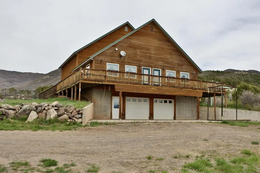Colorado mountain home on 54 acres for sale in Collbran, Colorado borders BLM land with spectacular views in a quiet, year-round accessible location. Located just off Kimball Creek road, the property has a large shop building, 3,200 square foot main home with basement with two garage doors, two hunting blinds, Kimball Creek running through the property, and stunning views of the Northern slope of the Grand Mesa. Historically used as a hunting lodge, there are 5 conforming bedrooms, 2 large bathrooms, an office, a large kitchen, dining & living room, walk around porch, and large 2,000 square foot unfinished basement with meat processing area, parking for two cars and plenty of room for storage. A drilled water well supplies plenty of domestic water for the main home, and a modern forced air heating and cooling system for the entire home. Built from wood frame construction with log accents, vaulted ceilings, wood floors, custom tile work, and efficient windows lends this home to year-round occupancy in mountain comfort.