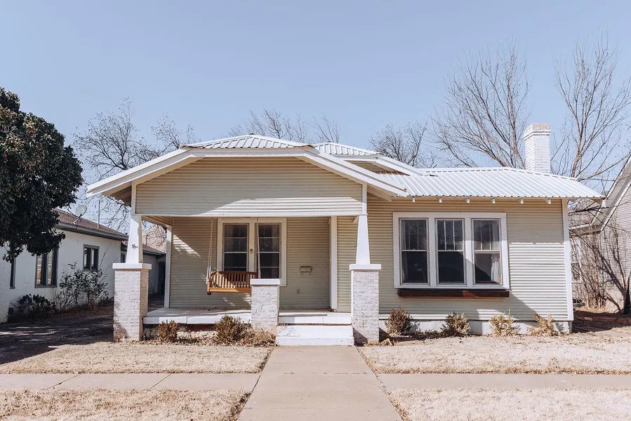 ''FRONT PORCH SITTIN.'' in a Peaceful neighborhood close to Childress Elementary School. Relax in the open living and dining area with wood flooring and working fireplace. 2 bedrooms also have wood flooring, large windows and direct access to the bathroom. The bathroom has improvements with a tiled tub/shower, updated vanity, and tile flooring. Improvements in the kitchen include tile flooring,granite sink, wood countertop, and open concept upper cabinet area. A small breakfast nook sits in the kitchen as well. (Appliances are negotiable). 3rd bedroom has laminate flooring and a large closet. Utility area has washer/dryer hook-up and updated water heater. Very shaded backyard with a storage shed and a partially built fence. Detached garage with electricity on the SW corner.