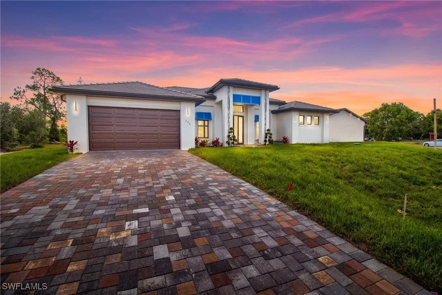 Modern Elegance with a Colonial Touch! Welcome to your dream home in Lehigh Acres! This brand-new construction makes a bold first impression with its grand entryway, tile roof, and symmetrical architecture accented by colonial-style columns. The deep-toned garage, double French doors, and chic blue awnings add a pop of character and style making it feel coastal and yet modern. Step into elegance with this stunning 3-bedroom + office, 2-bath home offering over 2,000 sq. ft. of living space! Located in one of the most desirable zip codes in Lehigh Acres, this home boasts high-end features and thoughtful design throughout. Features You'll Love! Luxury granite countertops & light-up kitchen cabinets. Formal dining room perfect for entertaining. Porcelain tile flooring throughout - sleek and durable. French doors leading into a spacious office. Grand master bathroom with a true hotel-style vibe. Elegant interior columns with a timeless colonial touch. Outdoor kitchen for Florida-style living. Pre-wired for high-speed internet access. LG stainless steel kitchen appliances ARE INCLUDED. These will be installed prior to closing. Tile roof & garage with convenient exterior door. Unbeatable Location! Minutes from I-75 & 82 Rd, close to the Lehigh Acres Hospital, top medical centers, shopping, dining, and great schools. Don't miss your chance to own this move-in-ready masterpiece. Luxury, comfort, and convenience all in. Property has been virtually staged.
