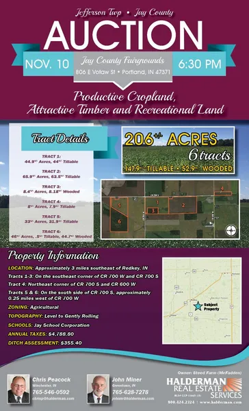 Legal Description: 200 acres, more or less, located in part of the SW 1/4 of S21, part of the N 1/2 of S29, and part of the NE 1/4 of S30; all in T22N, R13E, Jefferson Twp, Jay County, State of Indiana.