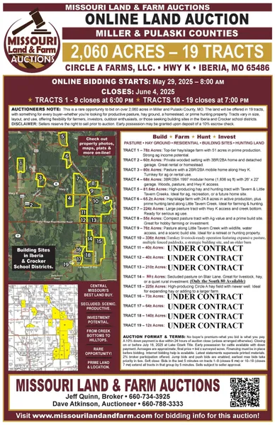 2,060 ACRES ONLINE LAND AUCTION MILLER & PULASKI COUNTIES, MO CIRCLE A FARMS LLC -HWY K, IBERIA, MO 65486