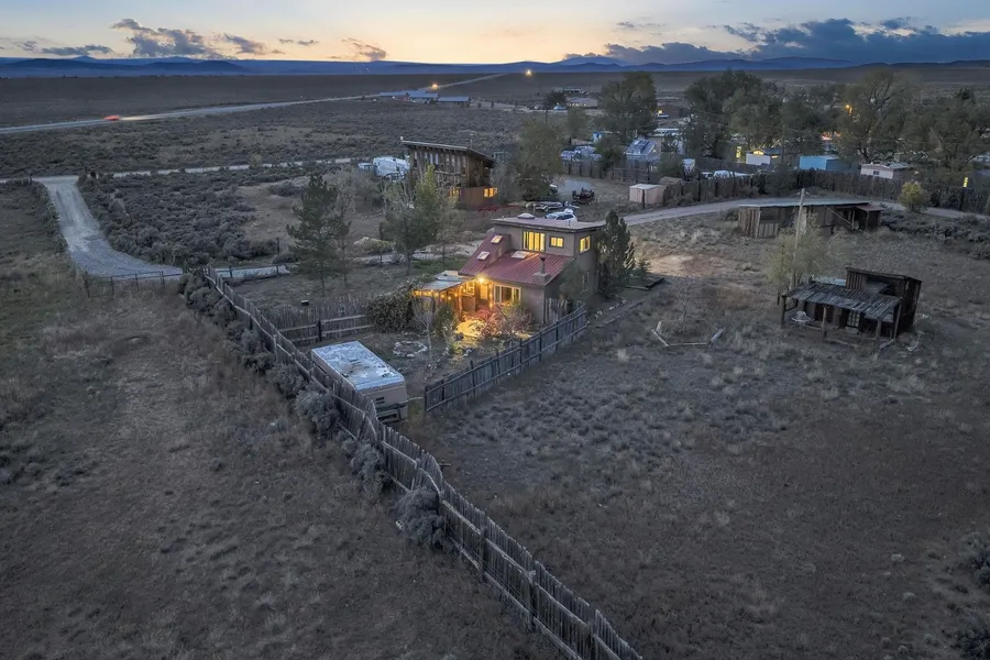 The Taos Escape You've Been Searching For ~ In the Upper Colonias neighborhood conveniently located near Highway 522, you will find this perfect little home situated on three-quarter acres of land with stellar mountain views. The residence capitalizes on panoramic southern exposure which helps to keep the home nice and warm naturally. Inside, the fluid, open-plan is enriched by a traditional kiva fireplace, a reclaimed Spanish-era timber beam, with classic brick floors. The upper level contains a private sanctuary, complete with slate flooring and magnified mountain views. The exterior features a small portal with bistro lighting beside the garden and a secure, fenced perimeter for pets. The grounds are surrounded by trees, punctuated by towering ponderosa pines and aspen. A detached, two-story annex (currently an artist's refuge) offers additional potential, and can possibly be converted to an equine enclosure, offering forty linear feet of secure storage. Here, you will be few minutes from the Taos Ski Valley, the Town of Taos, John Dunn Bridge at the Rio Grande, and many more desirable locations for outdoor exploring. this property presents a rare investment opportunity or a deeply personalized homestead, come see for yourself!