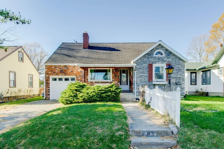 Rare opportunity in Roseland subdivision, classic 1948 Cape Cod on a 3-parcel property offering privacy, space, and endless possibilities, with approximately 1.25 acres and THREE garages (one attached, two detached) - ideal for workshops, storage, or hobbyists. solid wood multi-panel doors with original handles, genuine wood trim, and a welcoming covered front porch complete with swing and decorative rod iron railing. The main level features excellent flow-through ventilation between the living and dining rooms, anchored by a cozy wood-burning fireplace. The spacious 3.6-foot-wide hallway leads to a bedroom at each end, a full bathroom in between, and includes a deep closet for extra storage. The kitchen features solid wood cabinets. Upstairs you will find beautiful knotty pine throughout and an impressive master bedroom measuring 10' x 39' with a large walk-in closet. This home showcases the quality craftsmanship of its era, including a basement constructed with Belden brick walls - a prestigious Ohio-manufactured product. JACO waterproofing the basement on Feb 5th & 6th. A second wood-burning stove provides additional warmth and ambiance. Incredible potential to build instant equity. Awaiting your vision to create a dream home.