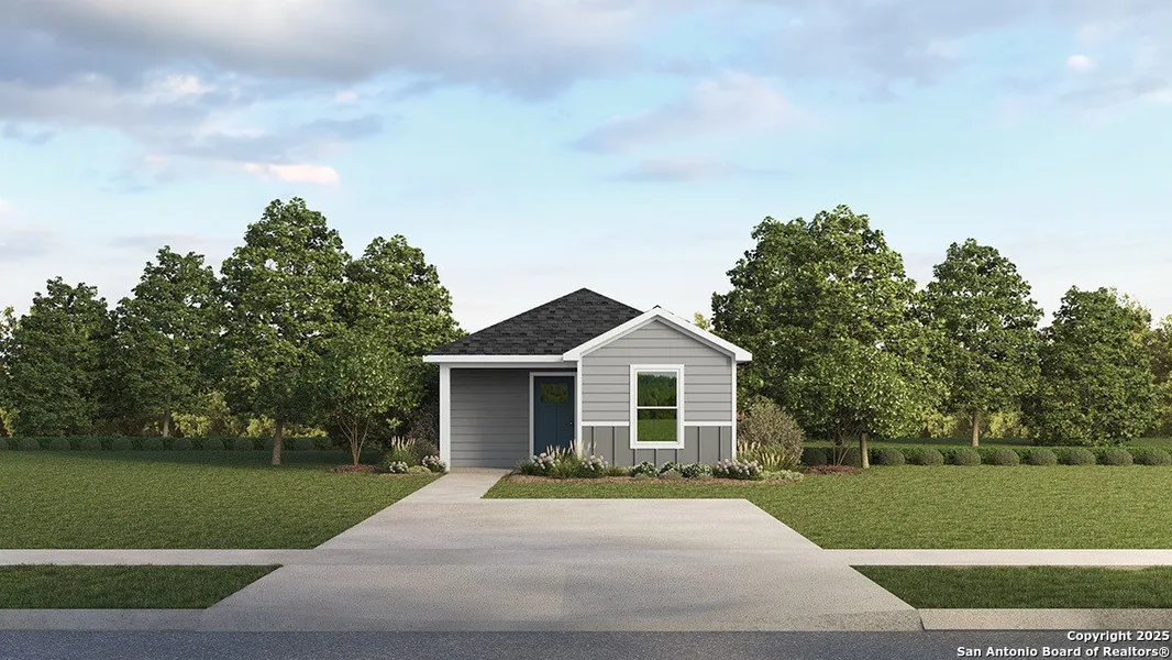 The Hannah, located in the sought-after Sonora community in San Antonio, TX, combines modern design with quality craftsmanship. This new construction, one-story home offers 2 bedrooms, 2 bathrooms, and 813 square feet of living space, with two all-siding exterior options and a spacious driveway, providing an inviting and practical space instead of a traditional garage. The open concept layout creates a seamless flow between the living room, kitchen, and dining areas, making it perfect for both everyday living and entertaining. The kitchen is equipped with stunning quartz countertops, stainless steel appliances, and stylish shaker-style cabinets, offering both functionality and a sleek, modern design. The main bedroom is a serene retreat, featuring soft, high-quality carpet flooring, a generous walk-in closet, and an ensuite bathroom with quartz countertops and a combined shower and bathtub. Additionally, all bathrooms in the home are outfitted with quartz countertops, ensuring both elegance and durability. The home is built with high-quality James Hardie exterior products, known for their durability and long-lasting performance, ensuring that The Hannah is not only beautiful but built to last. Hard surface flooring is featured in the living room, kitchen, and all wet areas, offering easy maintenance and a modern aesthetic. Patios are also included per plan, adding to the home's appeal and functionality. With these thoughtful features and a prime location, The Hannah is the perfect blend of style, comfort, and practicality in Sonora.