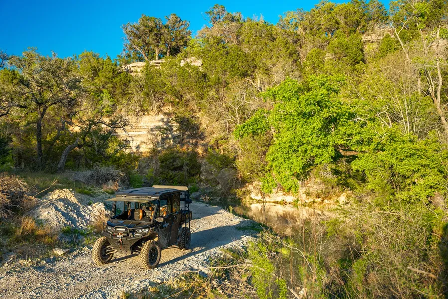 The ranch topography given its prime Hill County location offers a wide variation from essentially flat land, to box canyons, to a large ravine/valley. The primary topographic characteristic of the ranch is the Mustang Branch which bisects the ranch in a North to South direction in the northwest corner of the ranch. The highest elevation point is at the South side of the ranch at an estimated 1400 ft and the lowest elevation is at the Northwest corner of the ranch at an estimated 1220 ft. The elevation change between the Mustang Branch and the cliffs that overlook the creek is an estimated 60 ft.